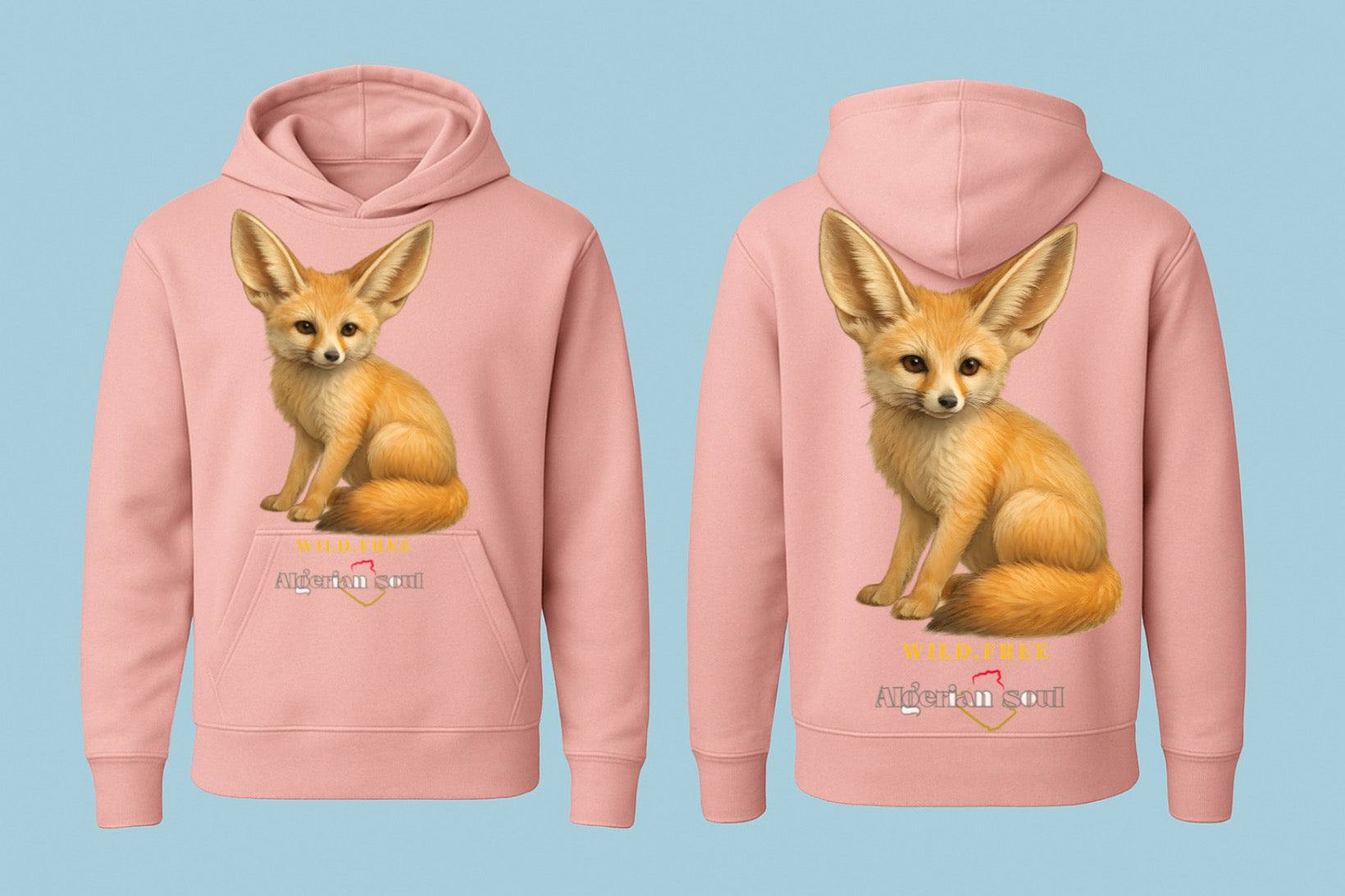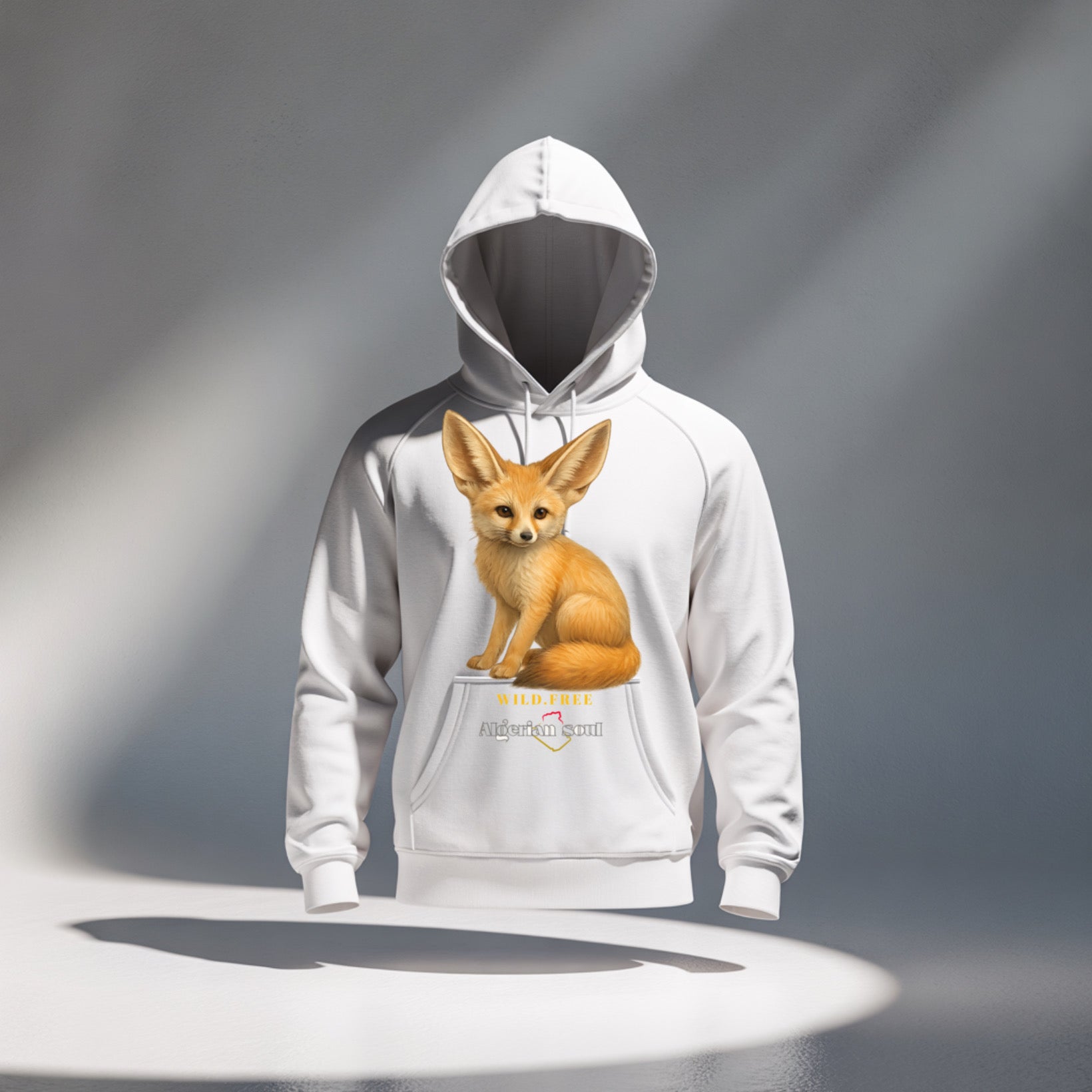The statement “WILD & FREE – Algerian Soul” is printed beneath the fox, along with a subtle gold outline of Algeria, grounding your style in cultural pride.