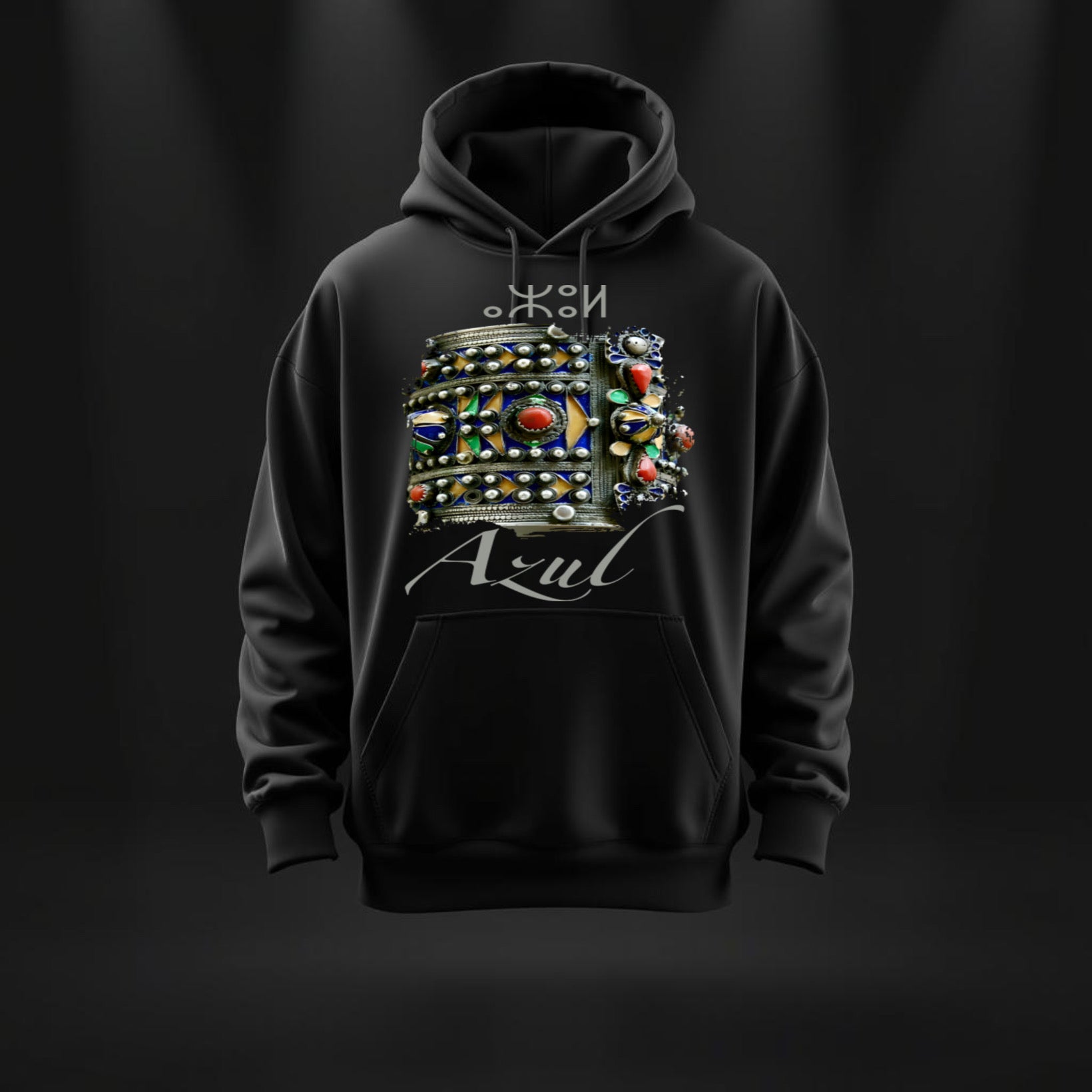 A powerful tribute to Amazigh culture — featuring the intricate silver and stone bracelet design, this piece is a wearable celebration of identity and resilience.