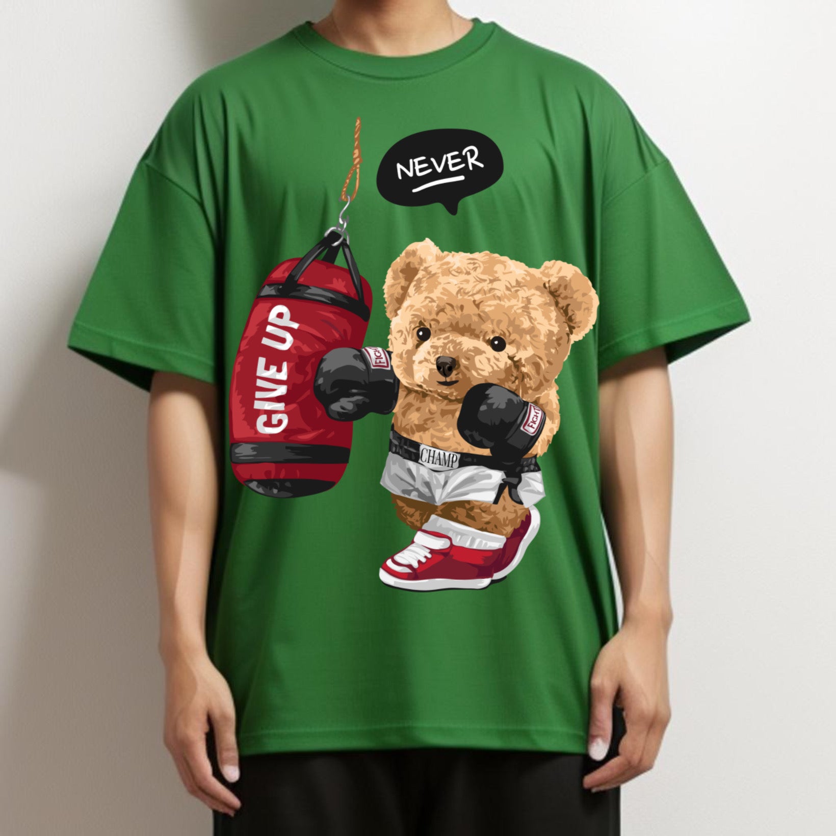 Small but unstoppable — the Fighter Bear tee captures pure determination. Featuring a tough teddy in boxing gloves facing a red punching bag labeled “GIVE UP,” with his fearless reply “NEVER,” it’s a playful yet powerful symbol of resilience. For those who fight through every round and never back down.