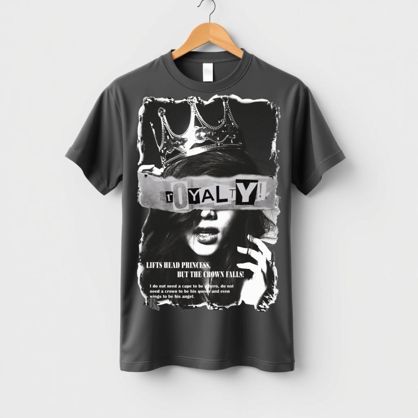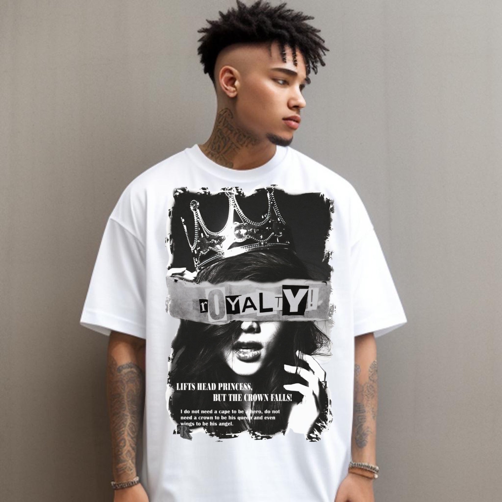 art t-shirt, black and white graphic, royalty tee, oversized streetwear, poetic design, minimalist art fashion, empowerment shirt, unisex style, bold aesthetic, modern urban wear