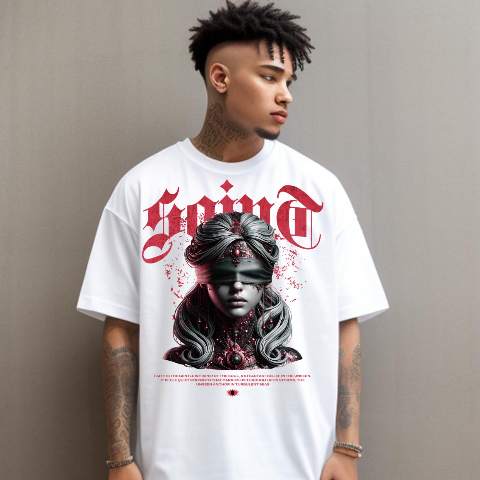 Bold. Mysterious. Sacred. The SAINT tee embodies silent strength — a blindfolded figure draped in divine elegance, symbolizing faith in the unseen. It’s about trusting your path even when the world goes dark. A statement piece for those who move with conviction, grace, and unshakable inner power.